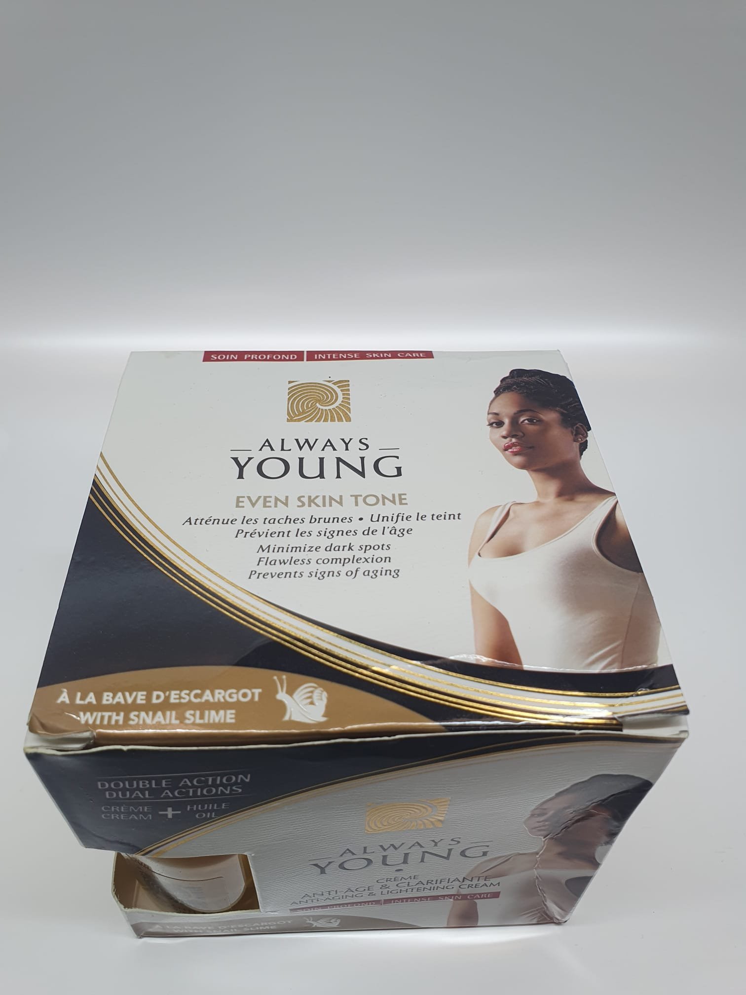 Always Young Crème with Serum is a luxurious anti-aging skincare set designed to moisturize, clarify, and restore youthful glow. Formulated with snail slime extract, kojic acid, and AHA, this powerful cream and serum combo helps to reduce signs of aging, eliminate spots, and enhance skin texture.
